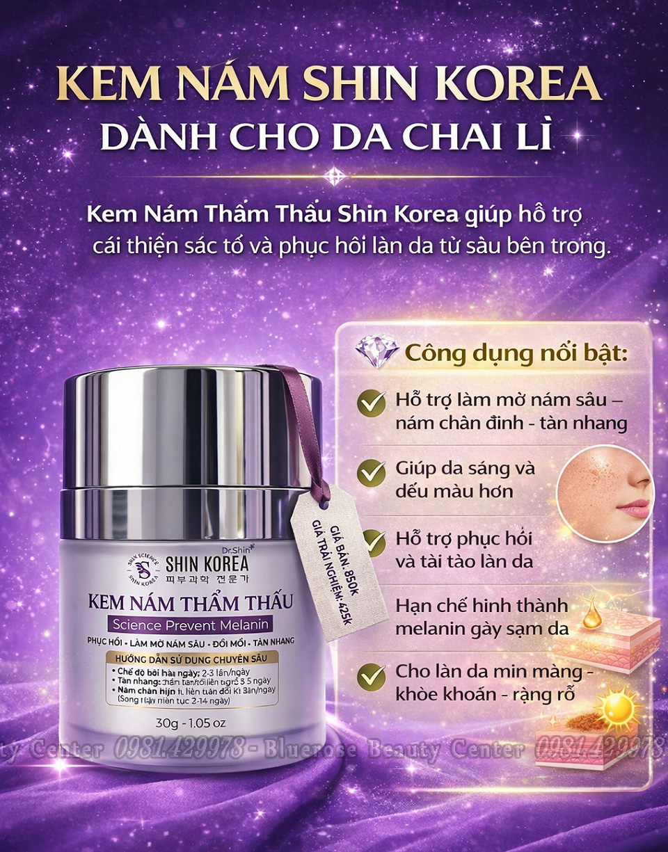 Nám, tàn nhang, đốm nâu lâu năm khiến làn da xỉn màu – kém tự tin? Kem Nám Thẩm Thấu Shin Korea giúp hỗ trợ cải thiện sắc tố và phục hồi làn da từ sâu bên trong.
