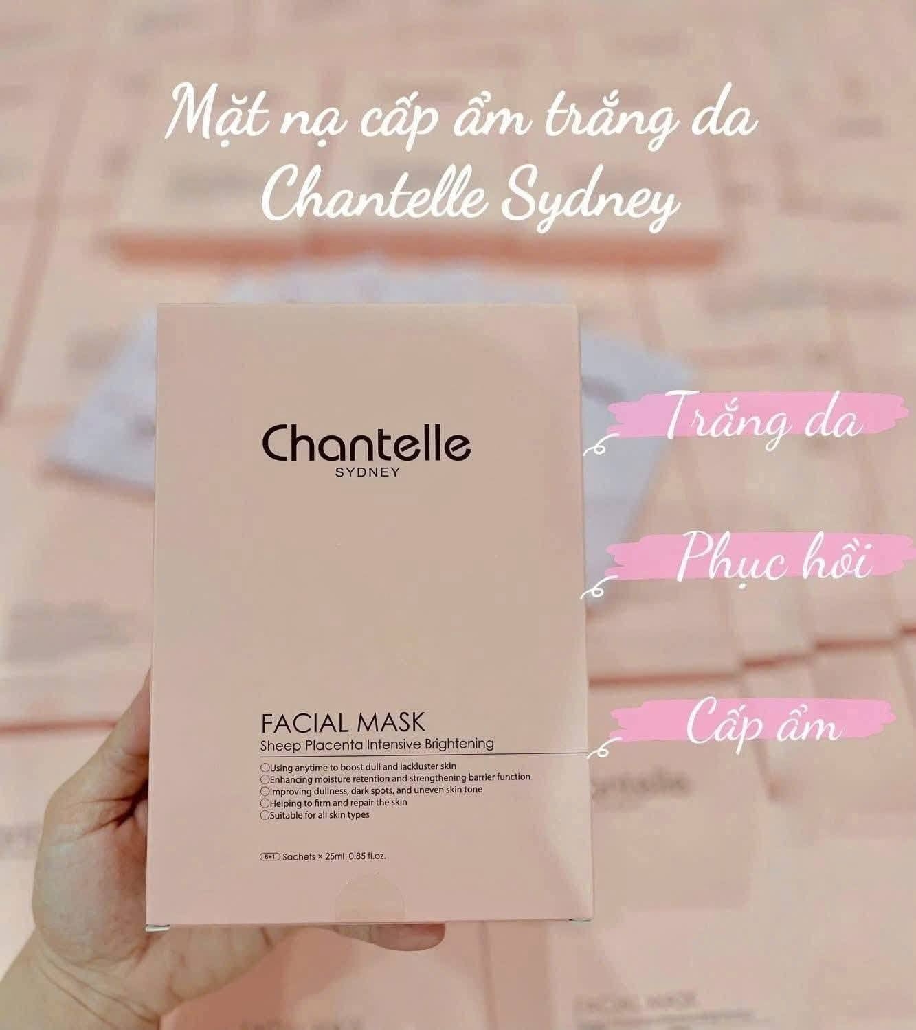 - Trong quá trình treatment da hoặc chăm sóc da chuyên sâu, mặt nạ đóng vai trò cực kỳ quan trọng giúp cấp ẩm, phục hồi và nuôi dưỡng làn da khỏe từ bên trong. Mặt nạ Chantelle Sydney luôn là lựa chọn ưu tiên trong các liệu trình chăm sóc & phục hồi da. THÀNH PHẦN & CÔNG DỤNG NỔI BẬT Sheep Placenta (Nhau thai cừu) - Hỗ trợ phục hồi làn da tổn thương, da yếu, da sau treatment - Giúp da săn chắc, mịn màng hơn - Cải thiện da xỉn màu, thiếu sức sống Khả năng cấp ẩm chuyên sâu - Bổ sung độ ẩm tức thì - Giữ nước lâu trên da, hạn chế khô ráp – bong tróc - Da mềm mịn, căng bóng ngay sau khi đắp Hỗ trợ làm sáng & đều màu da - Giúp cải thiện da sạm màu, da không đều màu - Da sáng khỏe tự nhiên, không trắng bệch, không bào mòn Phù hợp cho mọi loại da, kể cả da nhạy cảm. Chăm da không cần cầu kỳ – quan trọng là chọn đúng sản phẩm
